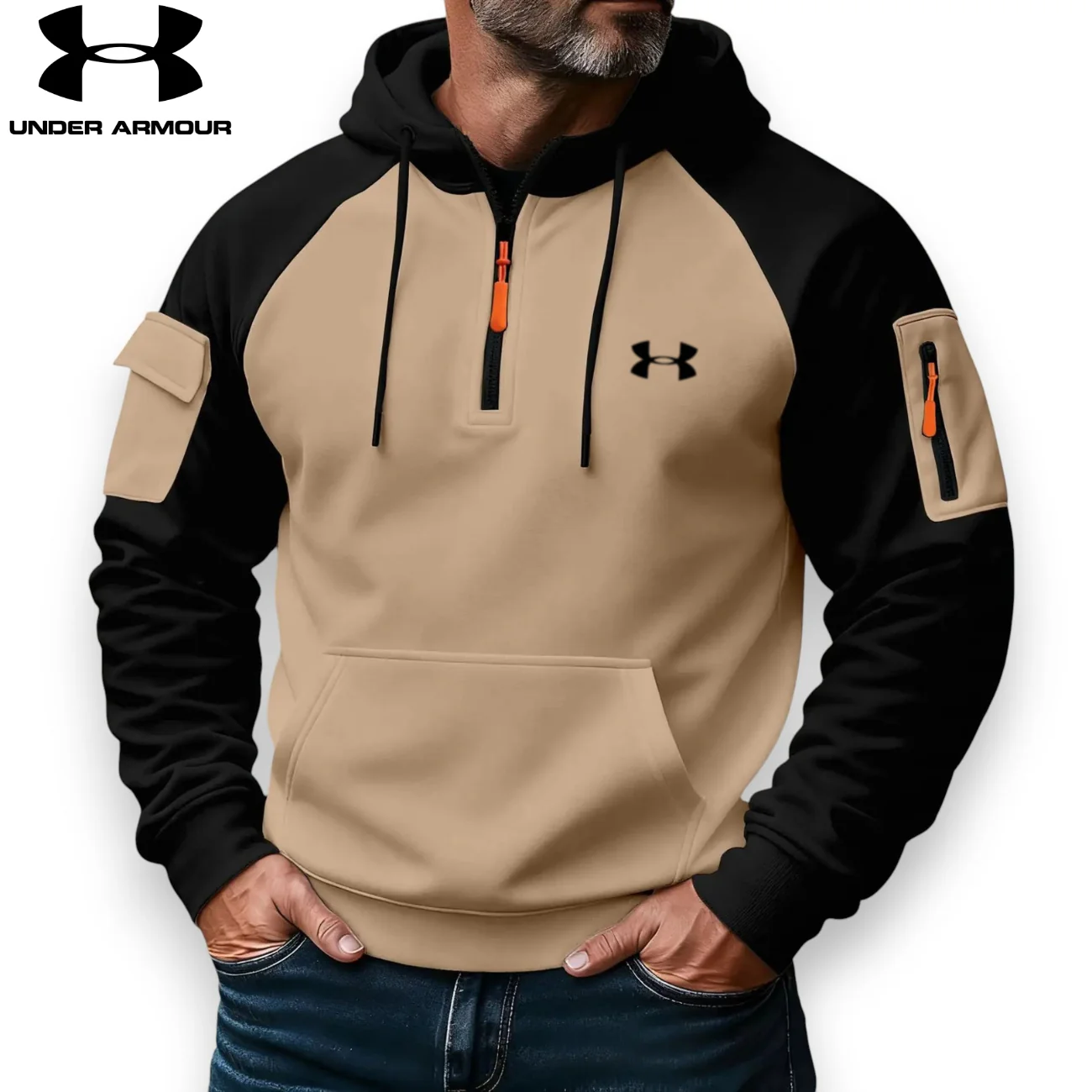 The half-zip neckline allows adjustable airflow and easy layering, while the front kangaroo pocket and utility sleeve pocket add practical storage without compromising style. With its tailored fit and premium construction, this hoodie balances comfort, performance, and everyday versatility.